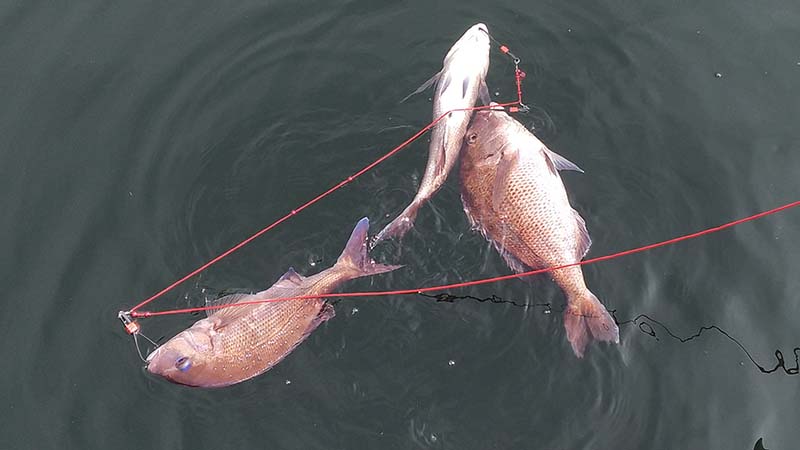 湾内のシマアジ(30㎝級)の養殖生簀に繋いでマダイ狙い