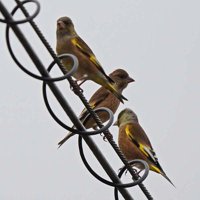 チョウゲンボウとノスリが一羽ずつ居たけど、確定には至らない。するとカワラヒワが5~6羽で電線に止まっていたので撮影しました。