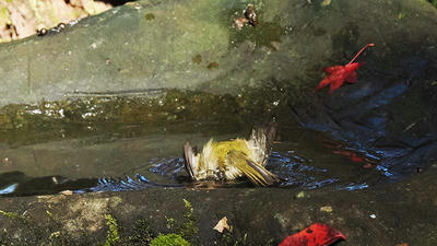 小さな小鳥だから、ヤマガラやミヤマホオジロが去ってから浴びます。