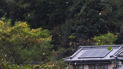 沢山の木の葉が横っ飛び、この様な風はあまり経験がない。