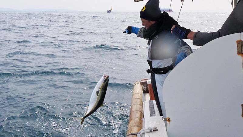 そんな中、数日前まで時化で漁に出られなかった彼は気合でブリを釣る。