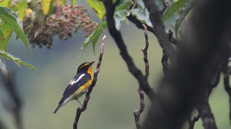 今回はキビタキの♂若と思われる個体に出会いました。一見すると♀にも見えますが、これまでの経験上、翼に白い斑紋が出ているのが♂若の決め手。空抜けで見難いですが頭も翼も少し黒っぽく、♂の特徴が出ていると判断しました。前からでも胸あたりまで色合いが濃くて、将来黄色になる様相を見せています。