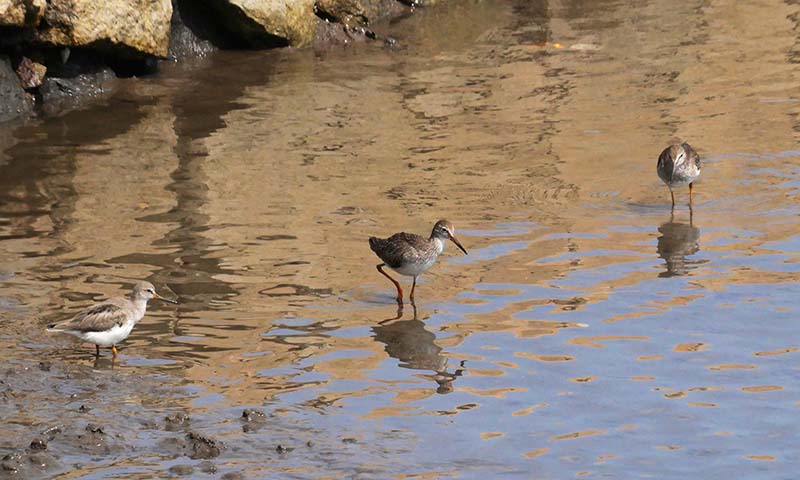 河口の干潟と石積みブロックに、2羽のアカアシシギとソリハシシギ多数。