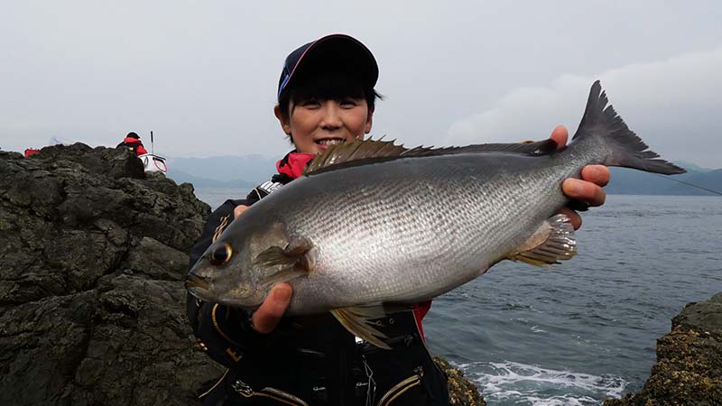 かなりの引きを見せてタモに納まる魚体は大きなイサキ。