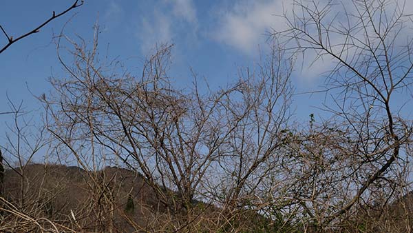 こちらも茨の藪を切り開いて進み、山桜に巻き付いている蔓を6本ほど切った。今年の花には間に合わなくても、蔓が朽ち果てて落下する来年が楽しみです。