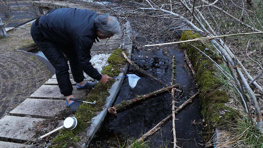 新しい水場の氷を割って除去した後は、ポリタンクから水を流し込みます。水場が再び凍らない事・波紋と水滴音でイスカが凍っていない事を認識できます。
