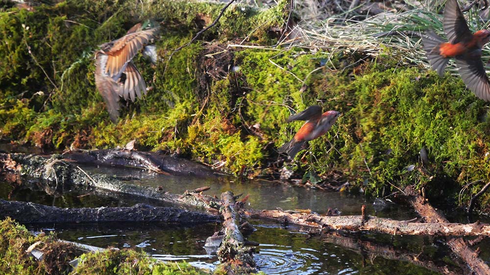 私が確認する限り左側の水場でのイスカは、ハイタカの攻撃を2度交わしており、彼らには安全で慣れた水場になっていて、凍らない限り使います。