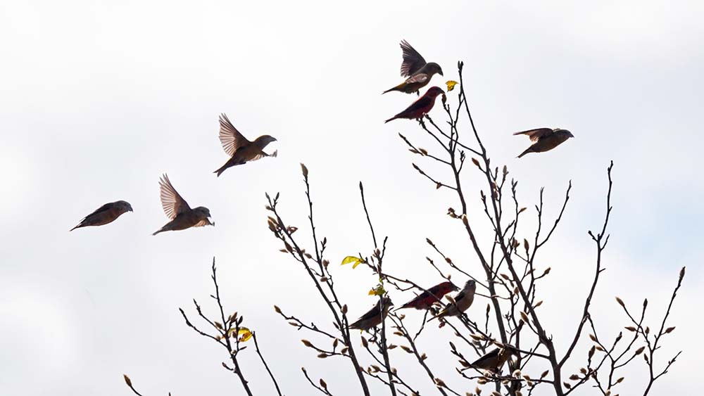 遠くの松の木に鳥の群れが入った。ほぼ確信してシャッターを切るとビンゴ。