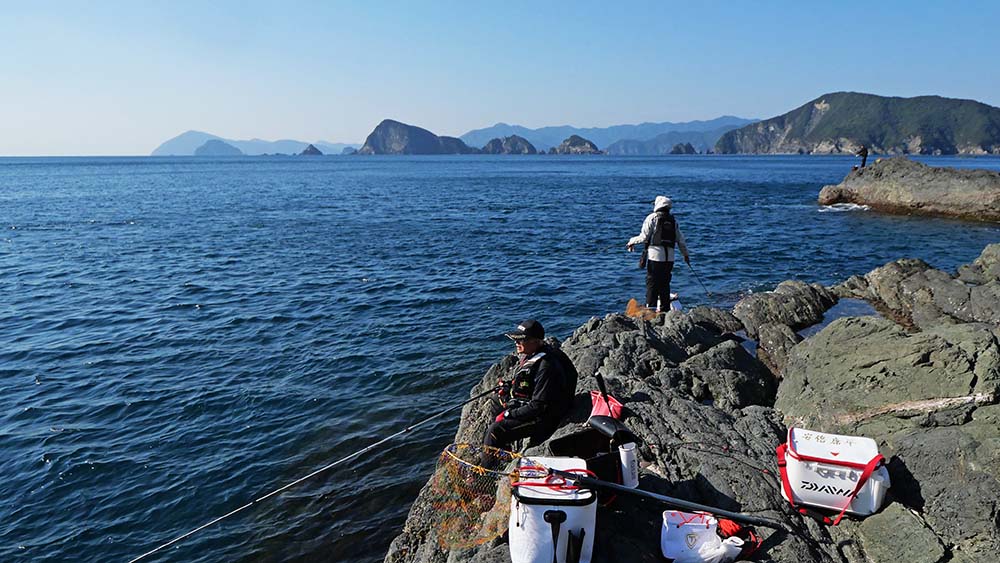 後の3人で並んで釣るものの良い結果になりません。私は適当に時を過ごしたり、ボイルのサシエで磯際を深く釣ったりしましたが・・福住さんや安倍さんはしっかりとフカセ釣り!グレやイサキを仕留めていました。