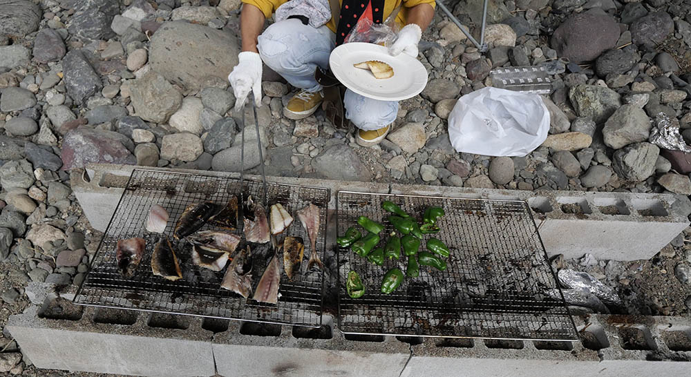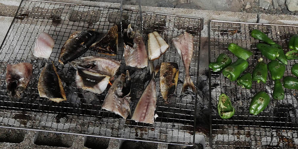 安定のモクズガニも塩ゆでで2匹半ほど食って、アユの塩焼きも大型を頂き、ウナギは蒲焼と白焼きの2種類。猪鍋はどんぶり2杯、タカさん調達のヒオウギガイも、カボス汁で焼くとさっぱりとした味。果物・デザートなどは口直しで時々。