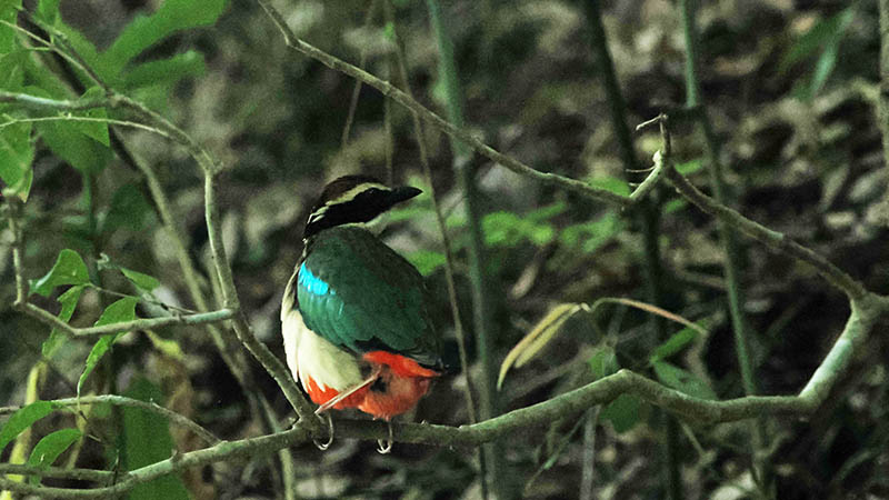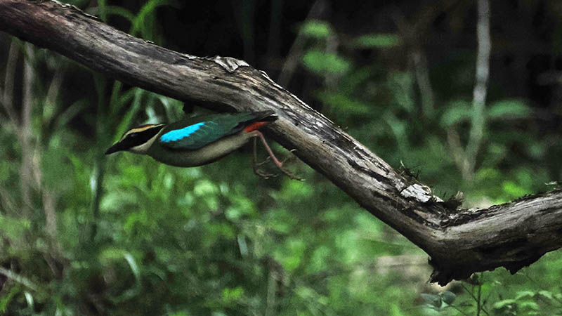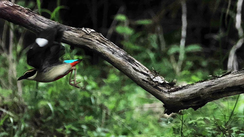 助手席側で鳥が動く気配を感じて見ると、ヤイロチョウが出た。