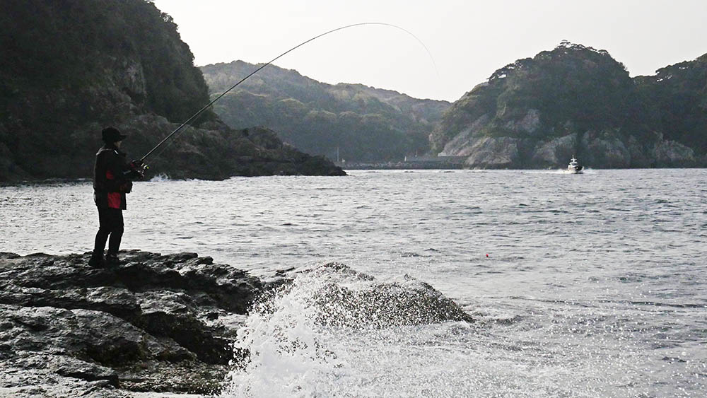 後方からの強風にマキエを乗せて大遠投を繰り返していると、この場所では珍しいオナガの40㎝オーバーが躍り出ました。時期的に少し早いのか?イサキのアタリは3人とも一度も来ません。上り潮が無くなるとアタリも無し。