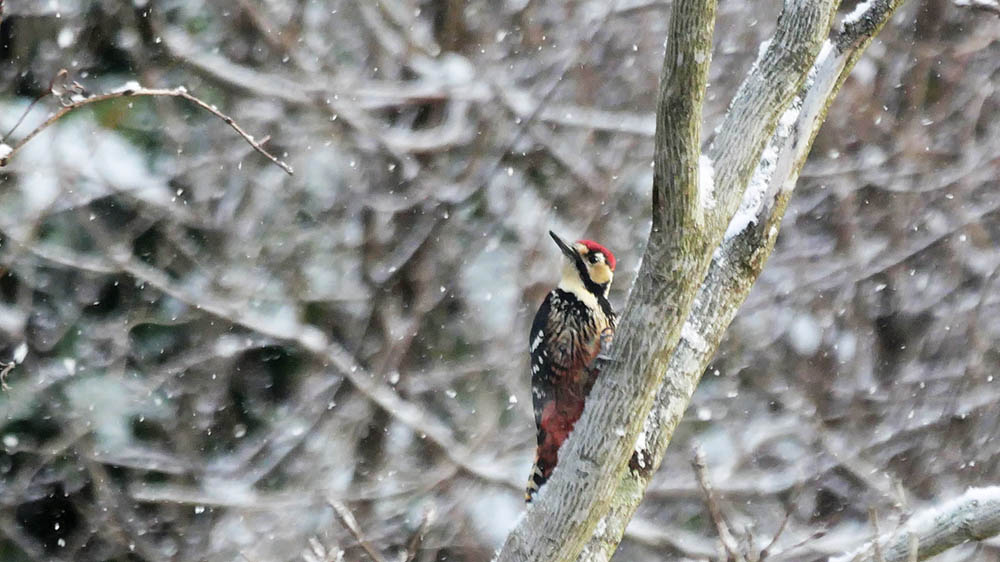 見晴らし台は雪も降ってくれて、ついでにオオアカゲラも来てくれた。