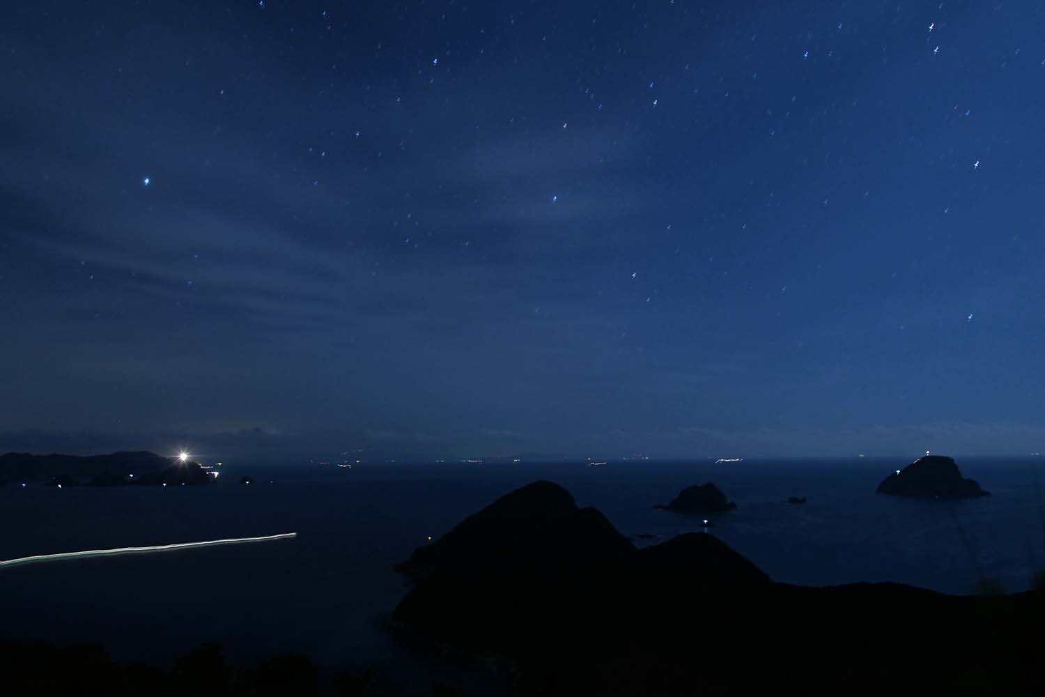 ss10秒。左の灯は米水津集落・右の灯は出る渡船・上は飛行機