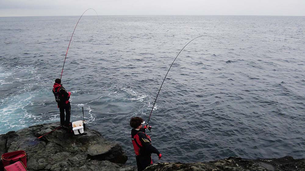 今回は横島一番で参加者たちと釣って欲しい・・そんな主催者の思いを胸に5名で上礁しての釣り。昨日からの東のウネリはまだまだ高く、釣り座が限定されているので、午前中の私は竿を出さずに監視員兼アドバイザーに徹します。