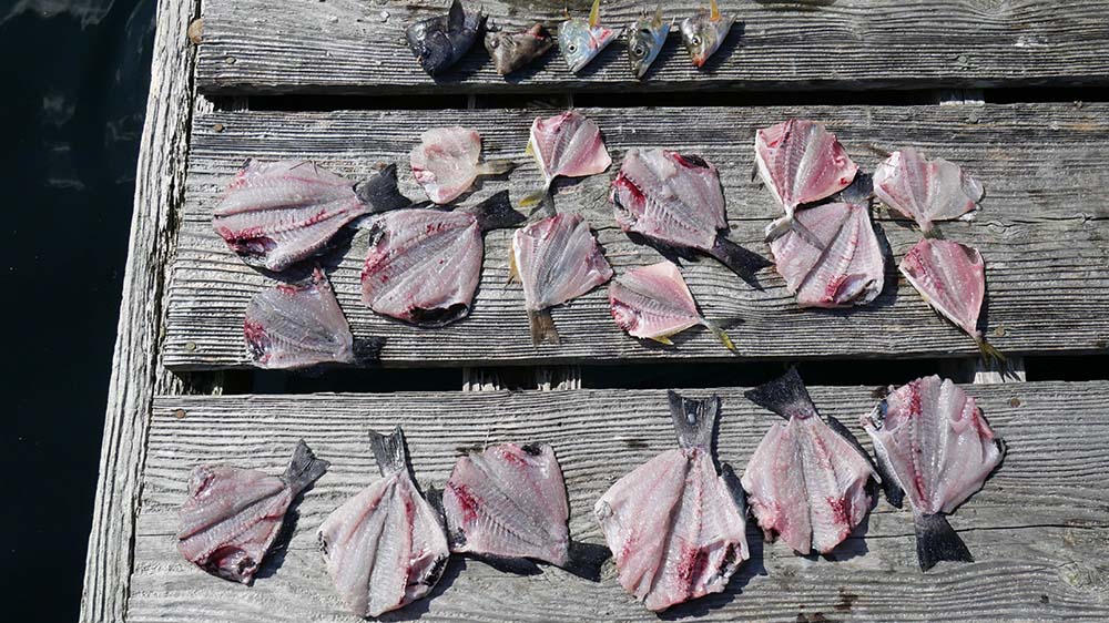 丸二水産の地の筏は使用料が1000円。今回は2~3ヒロの水深に80~90㎝級のマダイが5~6回ほど挨拶に来てくれました。70㎝級も2回ほど・・・マキエのオキアミは喰っています。7号ハリスのオキアミ房掛けやカラスガイなどは不発でしたが、キビナゴでは、一回だけ強い当たりがありましたが鈎には乗りませんでした。