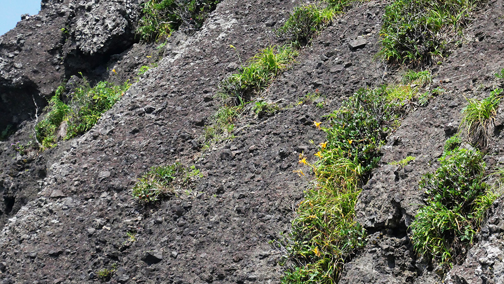 向った先は宮村さんと八反田さんが竿を振っている磯で、地図上では約150m程離れています。崖を越えたり海岸近くのゴロタ石群を歩き、ハンゲショウの花など撮影し、崖から転落した?と思われる雄鹿の骨を越えて慎重に歩を進めました。
