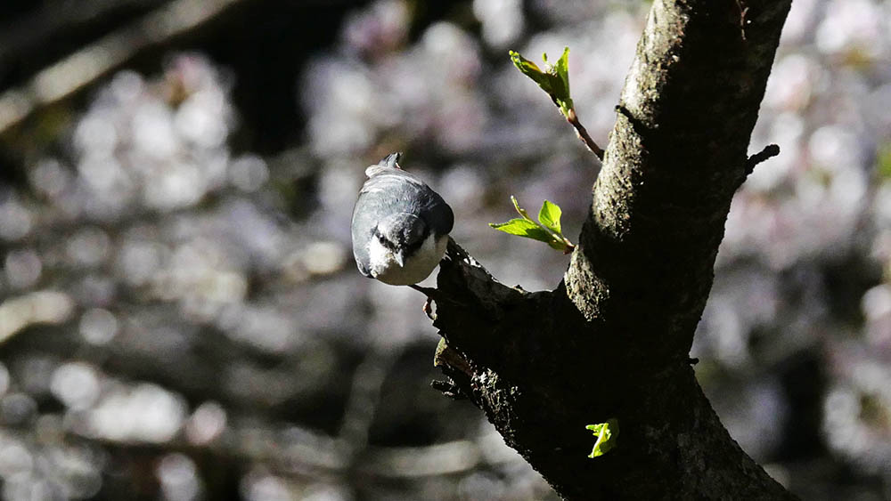 傍の桜の枝に止まってくれて、構想がズバリ当たりました
