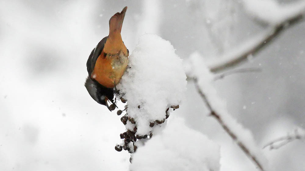 雪に包まれた県民の森に、雪予想で集合した変わり者3人と野鳥たち・・