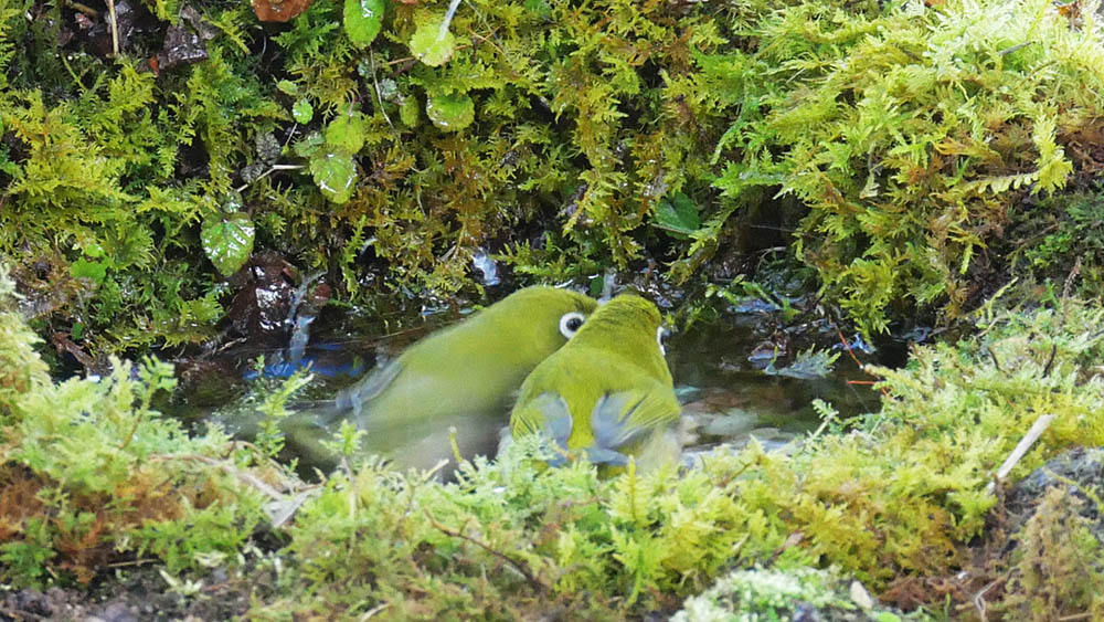 メジロの水浴び(そんなにしなくても)と眺める順番待ちのヒガラ