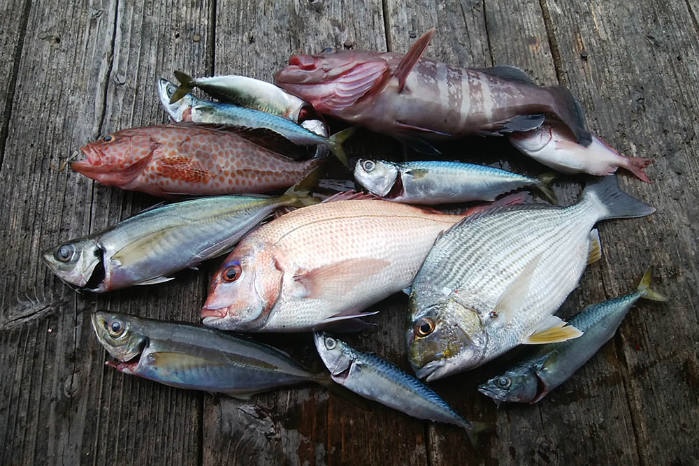 マキエをしながら水深25~30mのタナを狙ってマダイ・ヘダイ・ハタ類など。