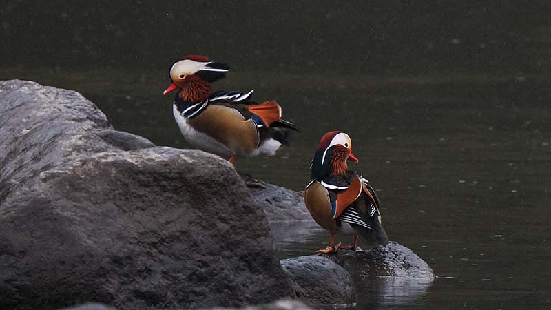 上流のカイツブリはクロカワムシを獲って、水中の虫も動いている証。