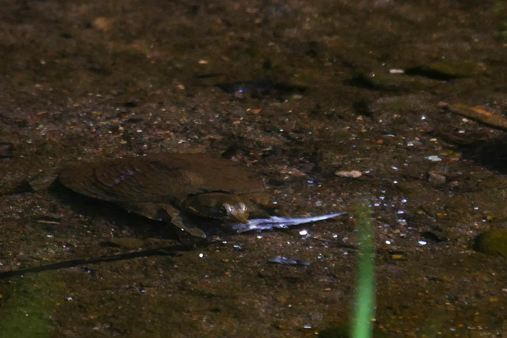 基本的にはバーダーの目は鳥を追っているのですが、他の自然の出来事も追うのが私流。そんな私の目に飛び込んできたのが、白い魚がもがく姿。良く見ると仔スッポンがオイカワをゲットして食べ始める所でした。