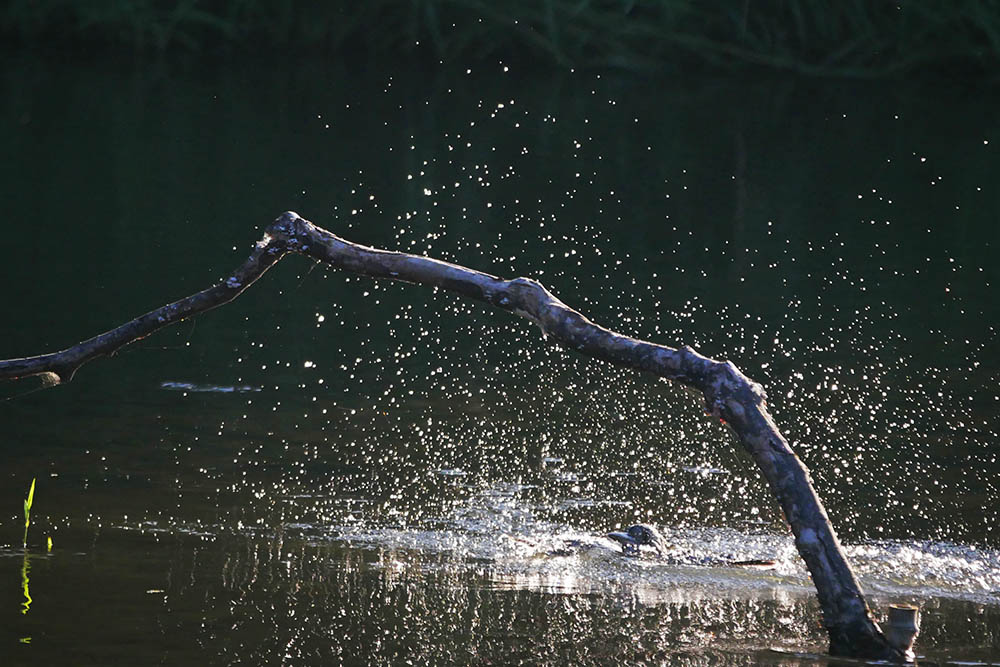 ヤマセミは水の流れに頭から豪快に飛び込み、突っ込む方法です。しかもこの水浴びは魚を食べた後に行うので、他の鳥達の水浴びとは一線を画しています。食べる時に魚のウロコやぬめりが着くので、それらを落とすのが主目的だと推測しています。