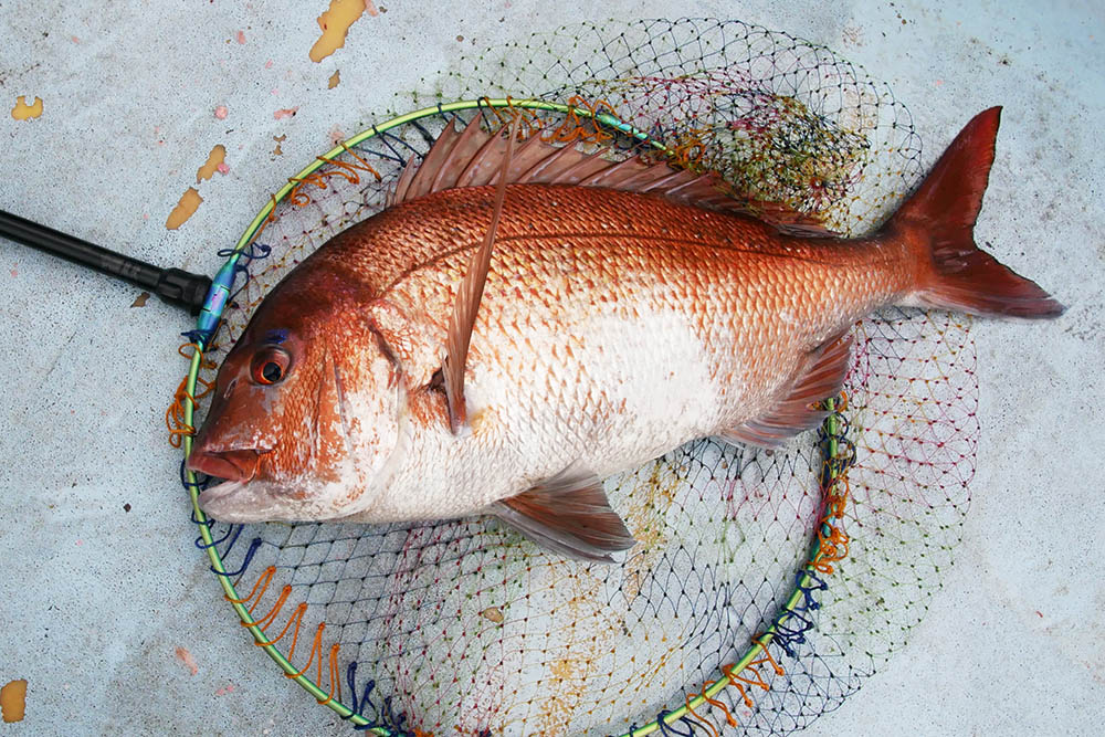 大型マダイはアジゴの中からゆっくりとアタリ、掛け合わせた時にはそれほど引きませんでしたが、それから一直線に走りだして頭を一切振りませんでした。もしかしたら青物?との考えでヤリトリしましたが、青白い魚体を見てマダイと分りました。