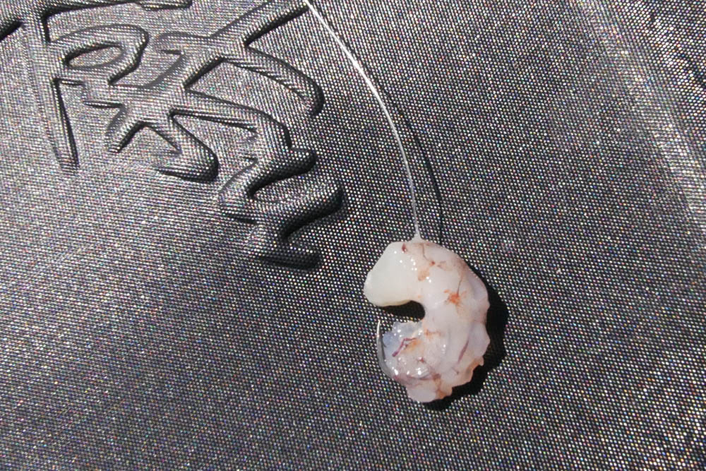 シバエビをムキミにすると6号のチヌバリ一杯、これでお土産確保