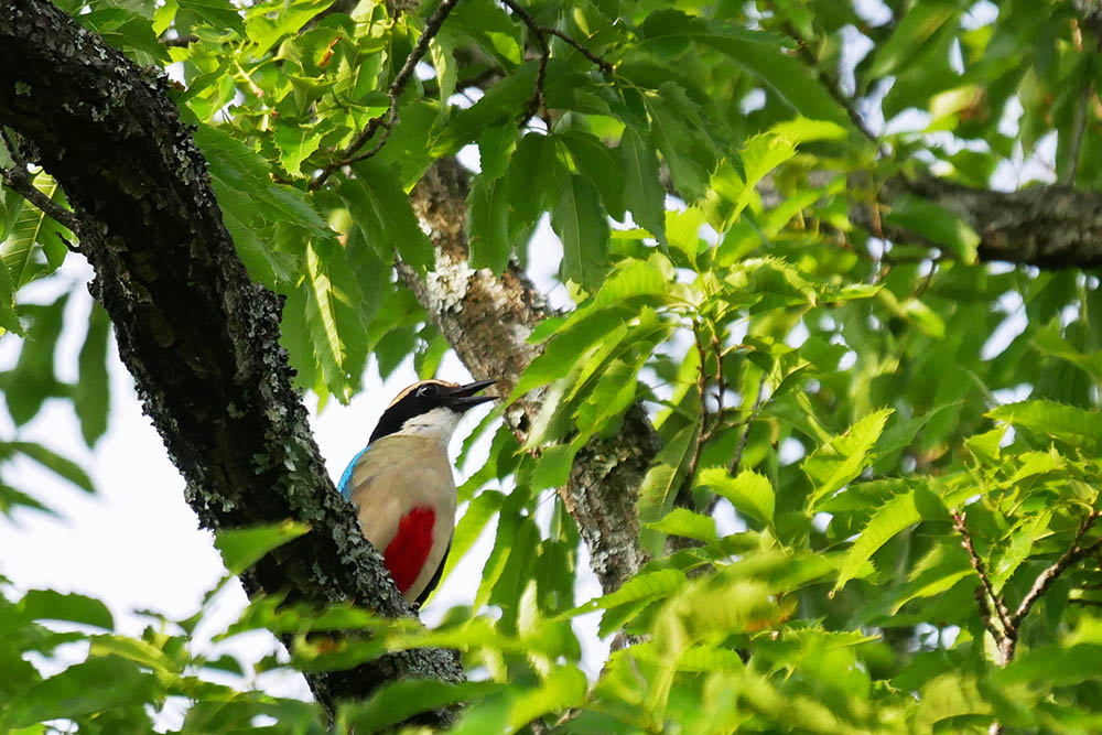 ♂が左へと去って鳴いた後、近くの樹間から後を追う様に一羽の小鳥が移動するのを確認、木々の葉っぱに見え隠れている小鳥に集点を絞るとヤイロチョウでした。