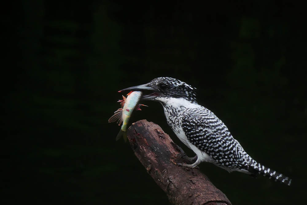 オイカワの♂を咥える♀のヤマセミ