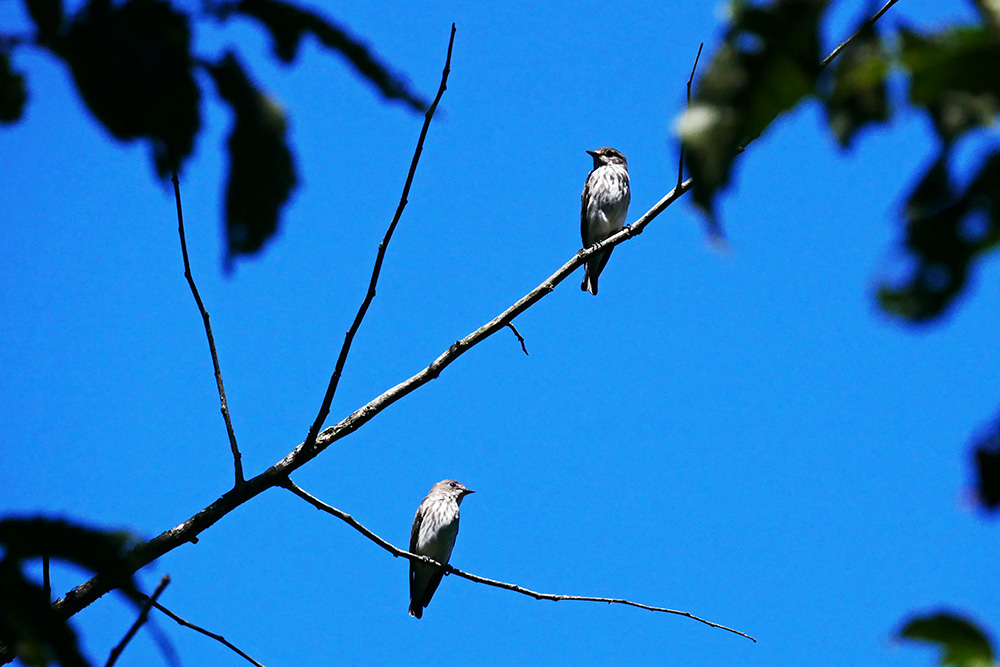 エゾビタキはミズキの実をホバリングで良く食べるので、木全体の輪郭部を見るのがコツ。でもこの場所は森の中、他の木々に遮られて部分的に見なければなりません。そんな不安を見事に打ち破って小鳥達がエサを啄んでいたのです。