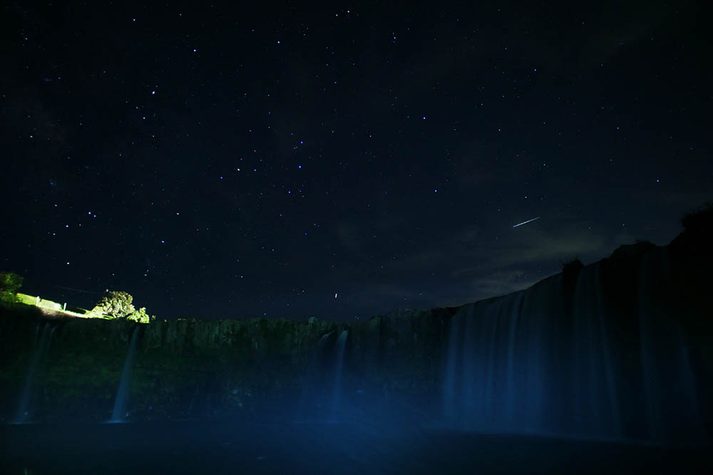 ペルセウス流星群が極大になる昨夜、原尻の滝で撮影を敢行。