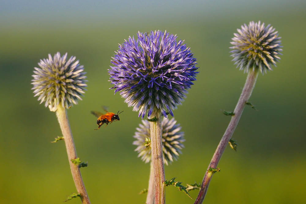 半分まで開花が進んだヒゴタイにトラマルハナバチ?
