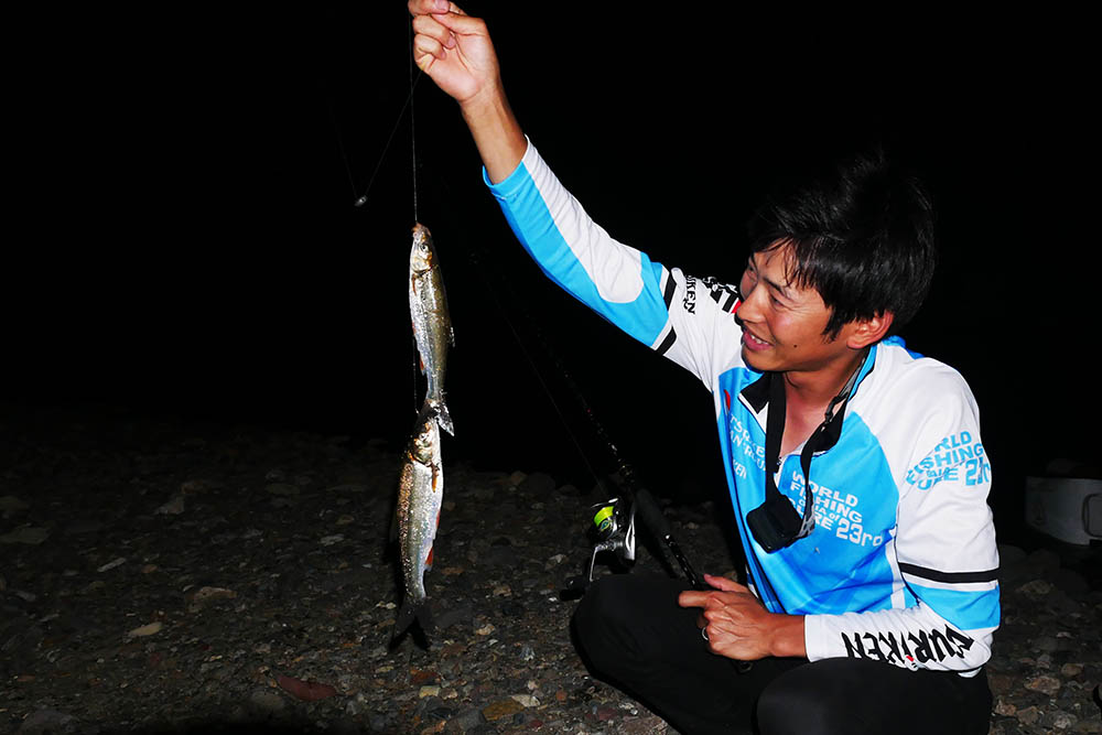 木村君はドバミミズをエサに1本バリの投げ釣り。