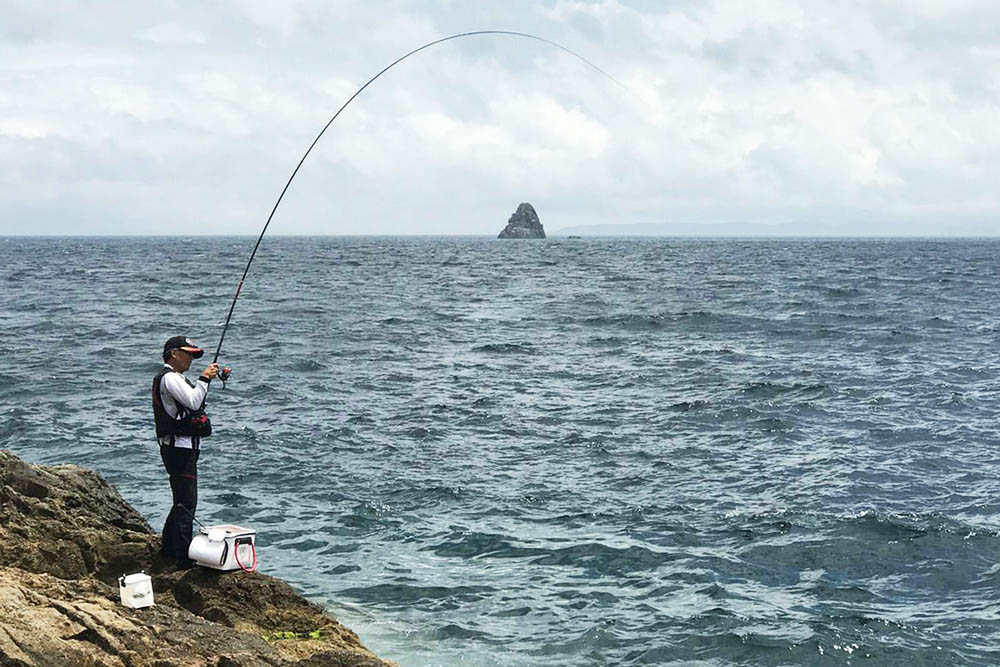 ポイントは一つ右に変わります。沖を狙うべく磯際に近い部分に多めにマキエを打ってその場所へ仕掛けを投じます。その仕掛けにグレやキロ級のオナガがヒットです。沖に遠投すると、かなり速い潮が右側の境界線まで仕掛けを運んでしまいます。