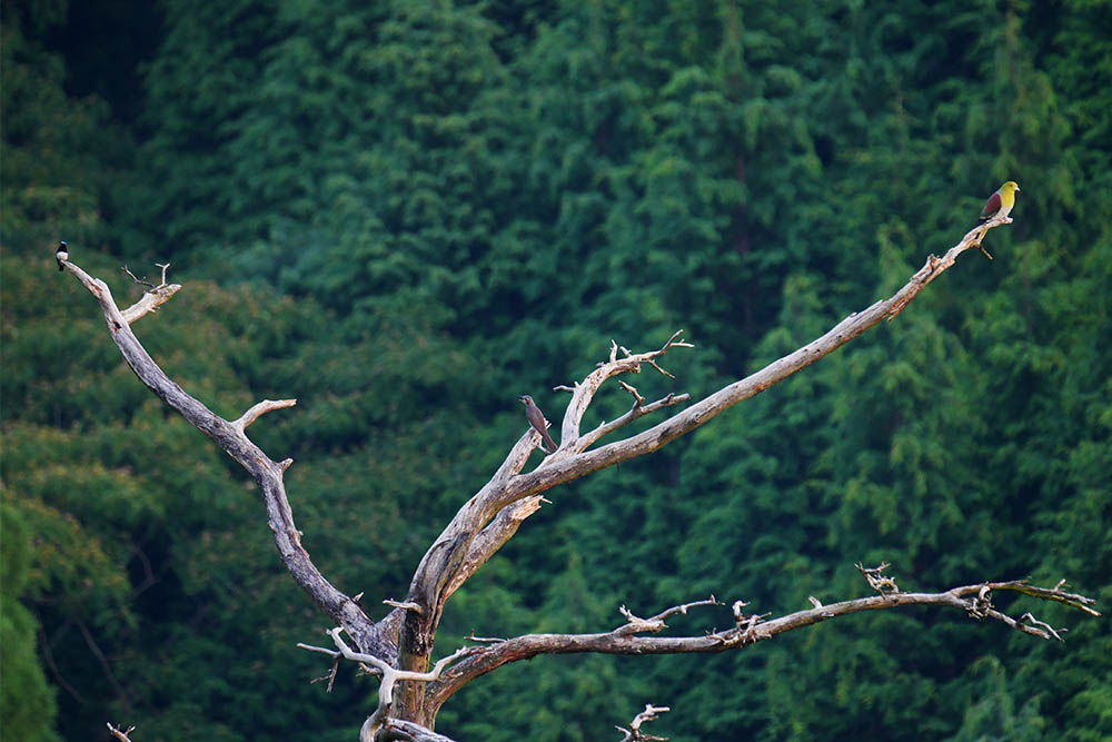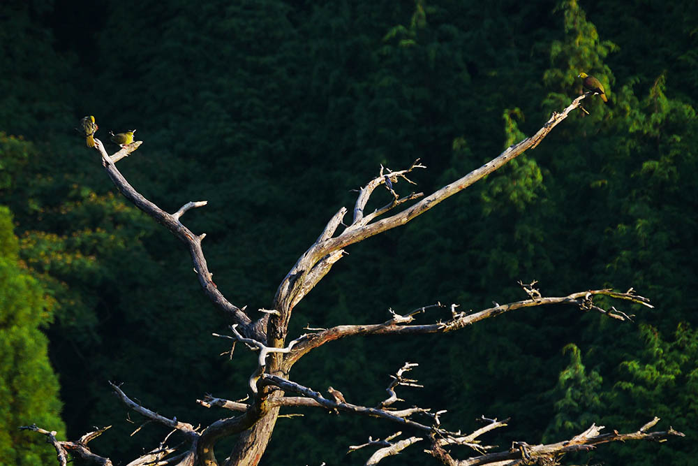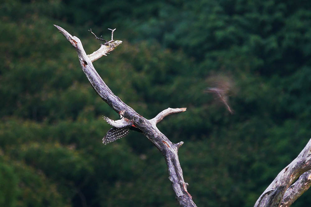 その後はヤイロチョウとアカショウビンのポイントまで移動。枯れ松に来る野鳥たちを撮影しながら聞き耳を立てていると・・・アカショウビンが1回だけ鳴きました。