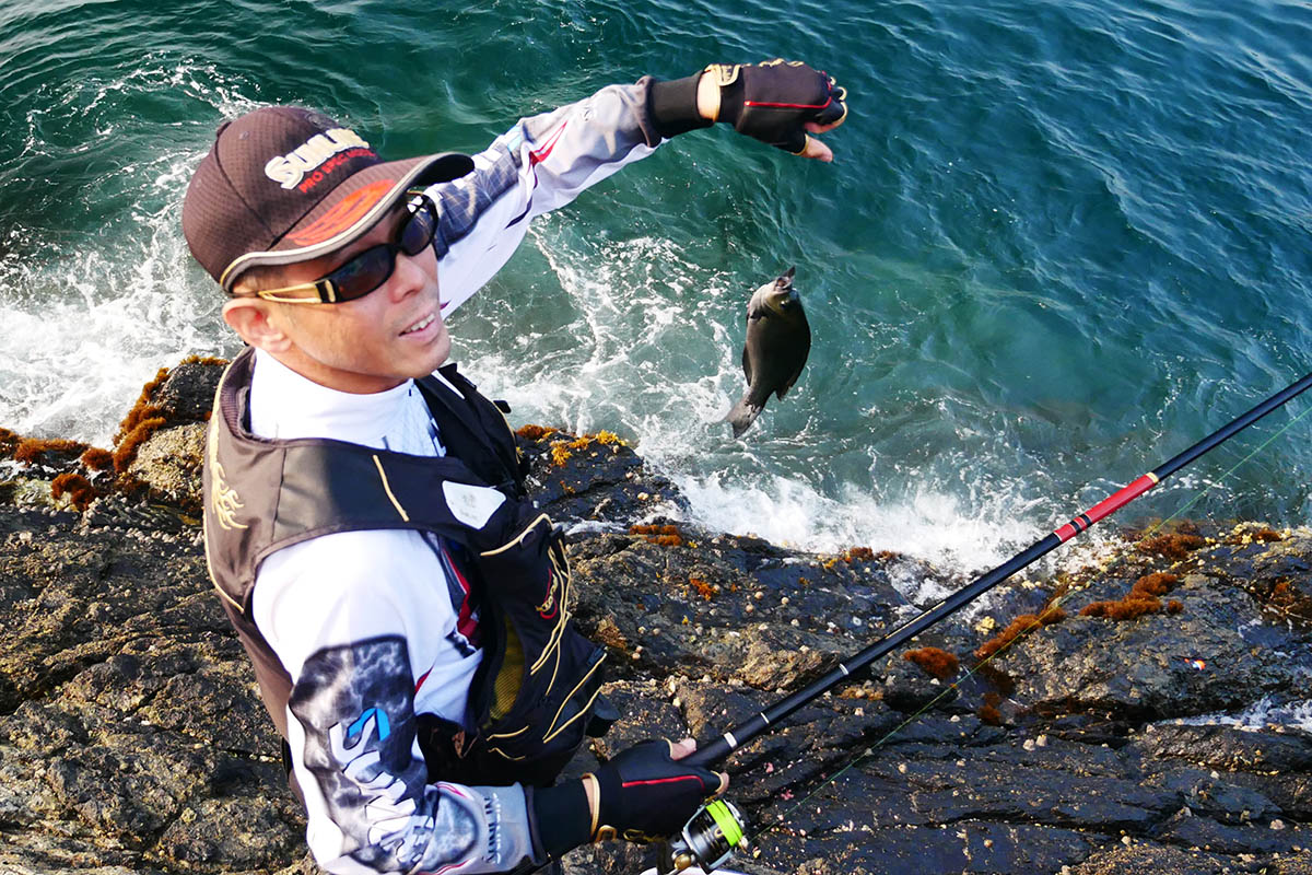 隣の磯で竿を曲げる福住会長、相手はカンさん