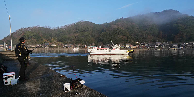 今回はキャノンボウル方式で、県内の好きな場所で釣って集まります。私は小林君・佐藤君らと一緒に、大入島の石間の内波止に渡っての釣り。