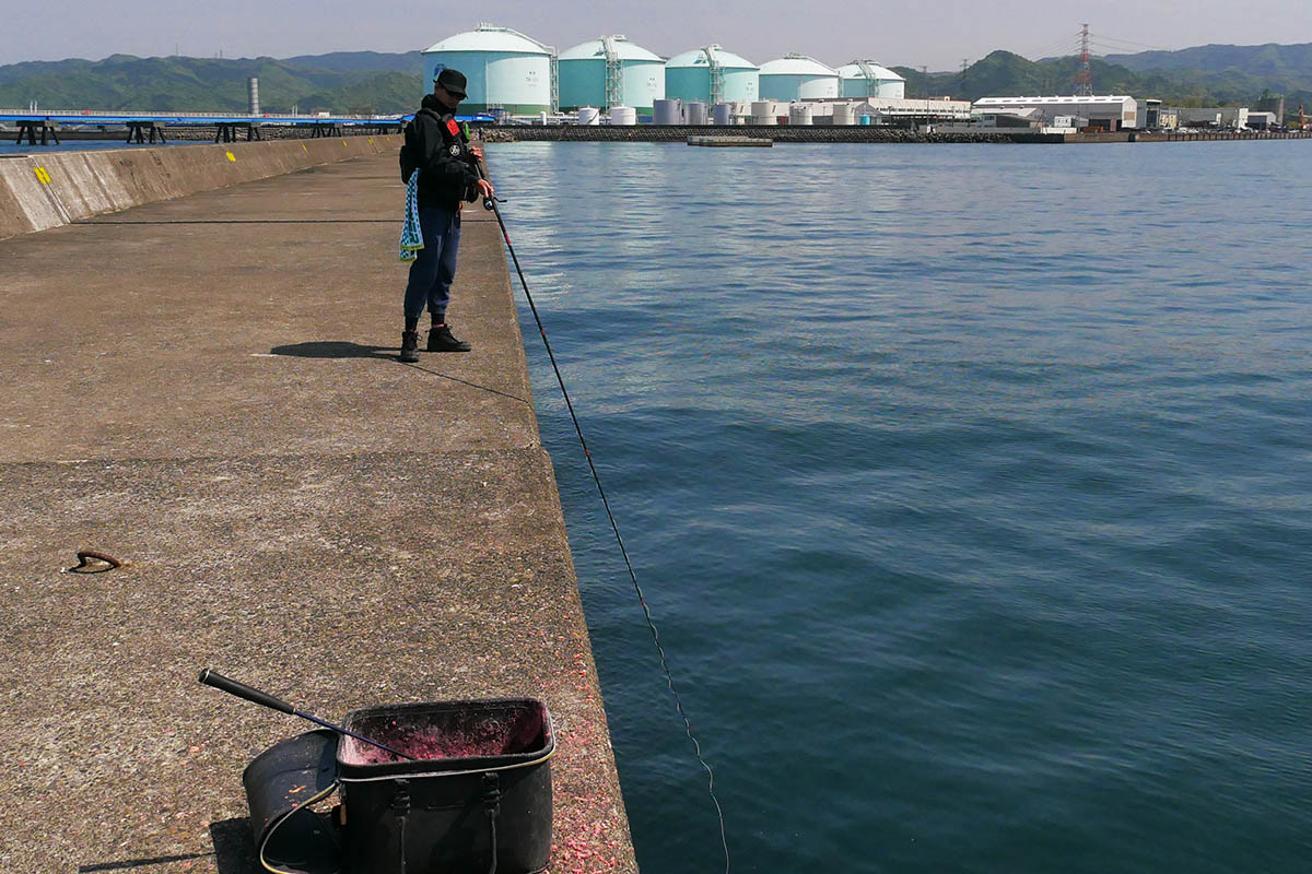 初めてのチヌ狙いは、マキエをしてあげながらレクチャーから開始。