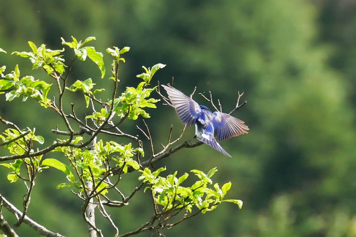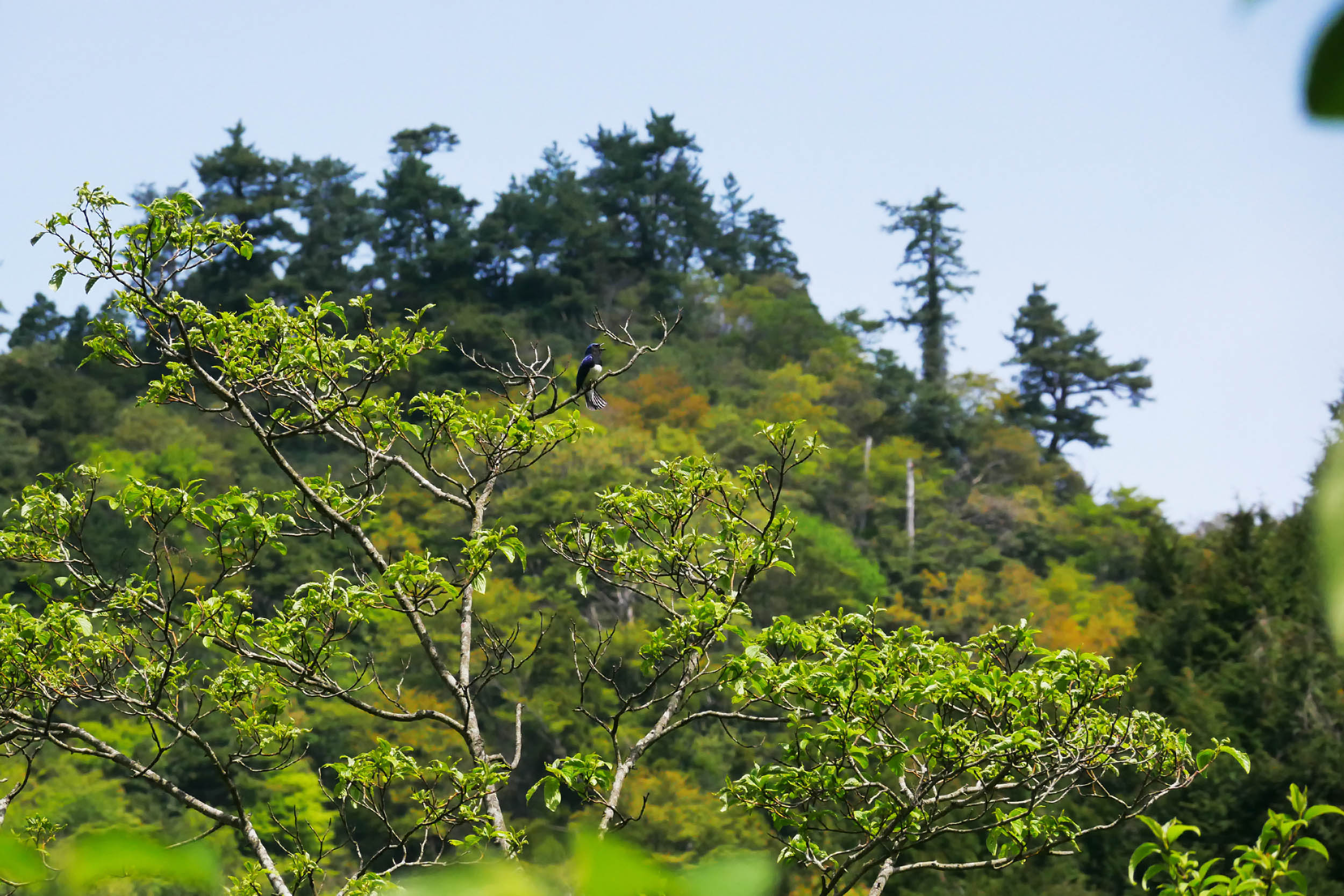 今朝は宇曽山側の谷をチェックして、花が散った山桜のオオルリを撮影出来ました。