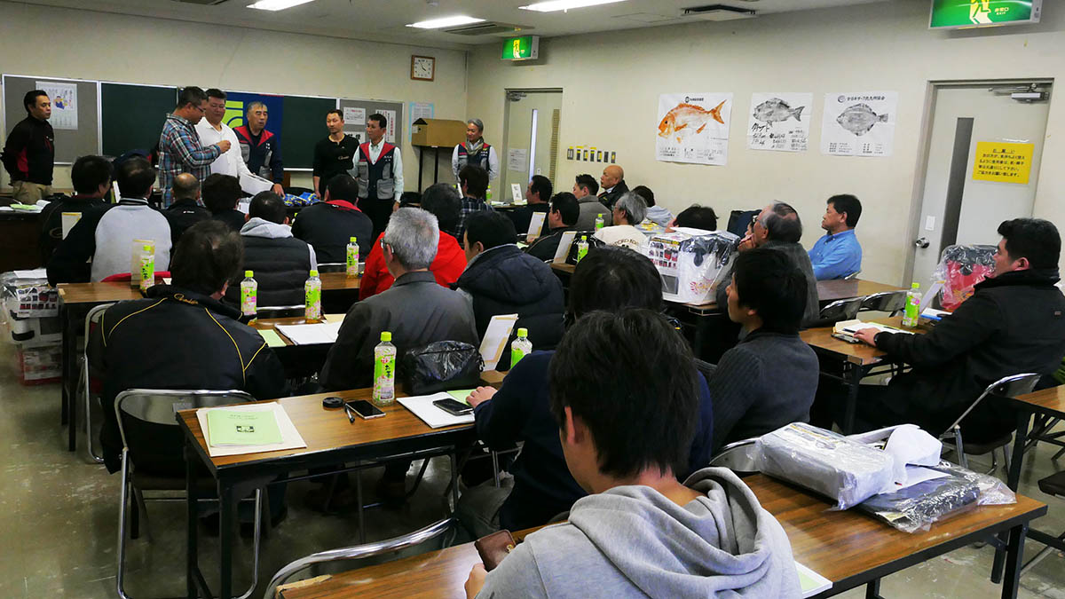 検量場所で待つと、エントリー者全員が集合してくれました。それぞれ、津久見市の長目半島・佐伯市の大入島・米水津・蒲江などで楽しく一日を過し、チヌの検量者は11名・グレの検量は3名となり、蒲江を中心に4名が2.5㎏以上の良型を出しました。