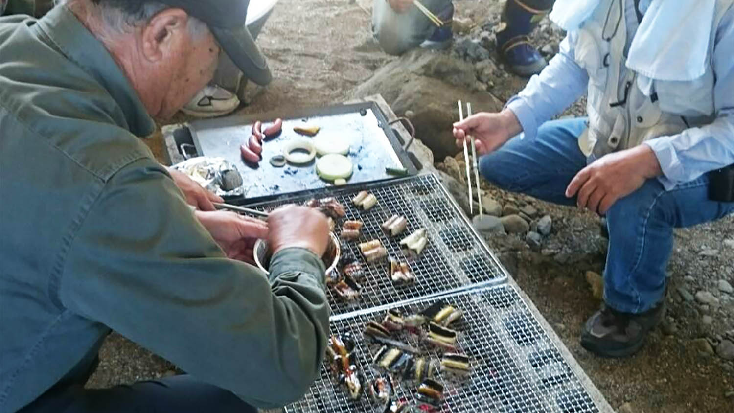 炭火で竹串に刺したアユを食べるのが、体育の日の恒例行事“鳥見会”です。