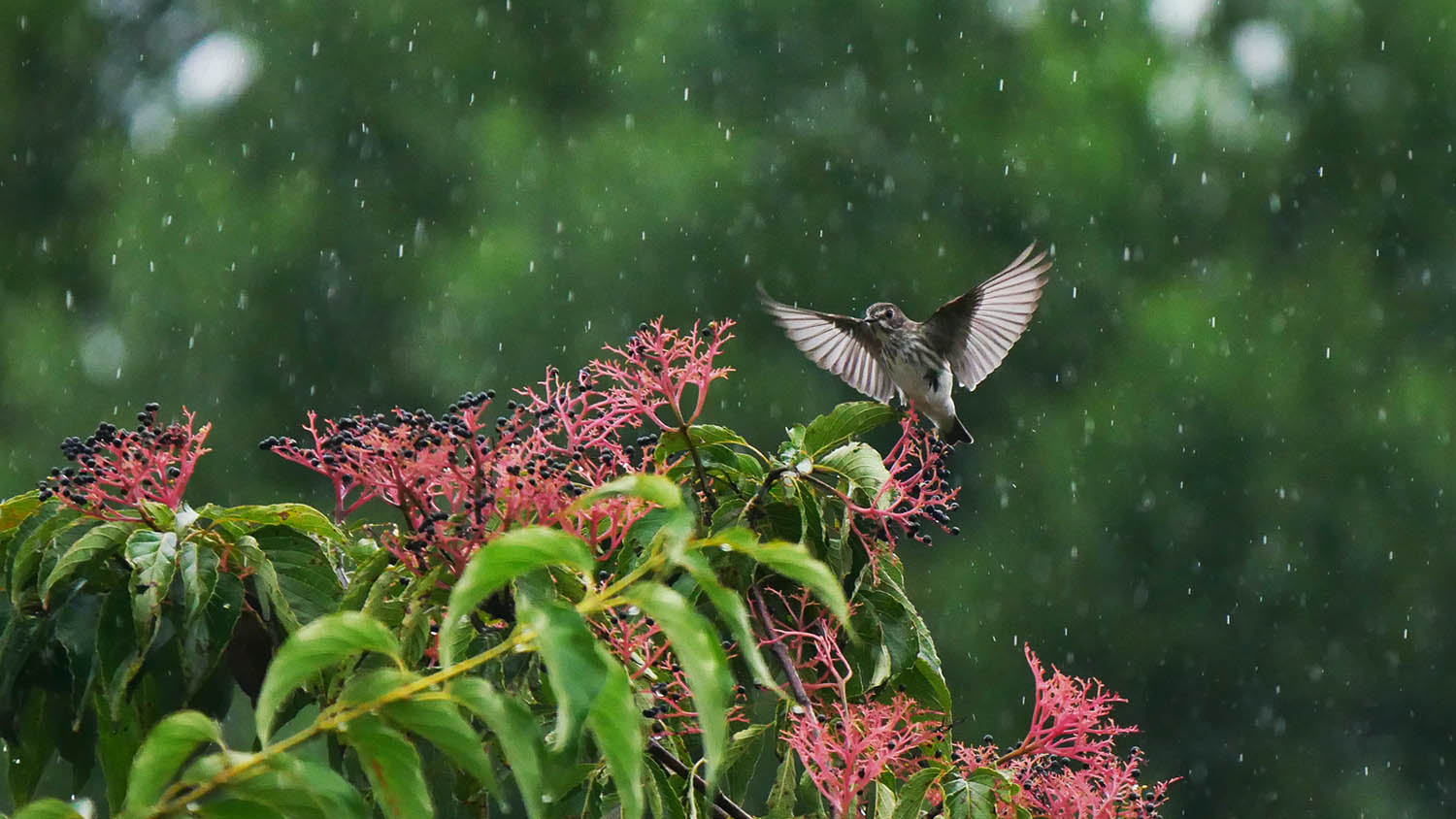 雨が小降りになったり、止んだりすると小鳥たちが一斉にエサを求めて動きます。