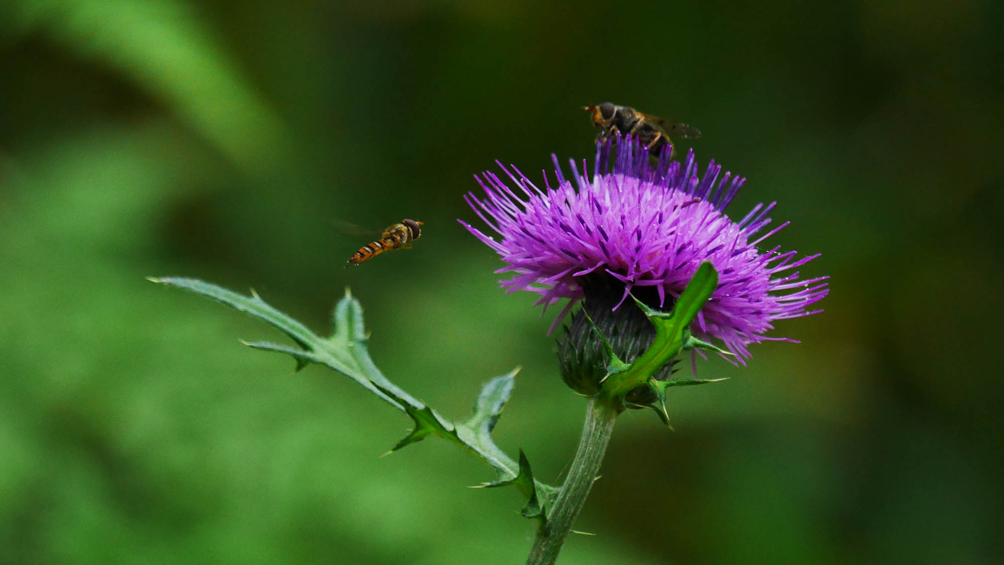 ノアザミの一種とホシツリアブ?・ホソヒラタアブ