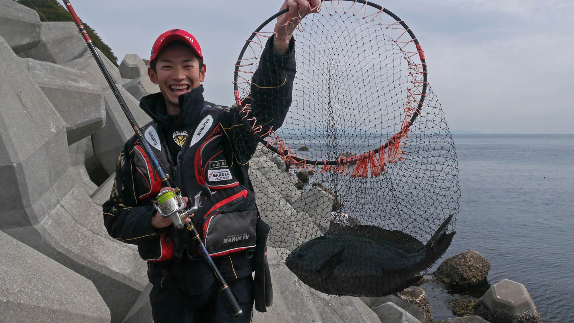兄義君とは大会などでの釣行は何度もありますが、これまで一緒の磯で釣りを行ったことは無かったと判断しています。真面目に釣りをしていましたが、喜びを体全体で表現する辺りは流石に役者です。悪戯にも笑顔で答えてくれるのも彼のお人柄、潮が引くと溜りが無くなる場所に、魚を生かすテクニックは真似しなくても良いでしょう。