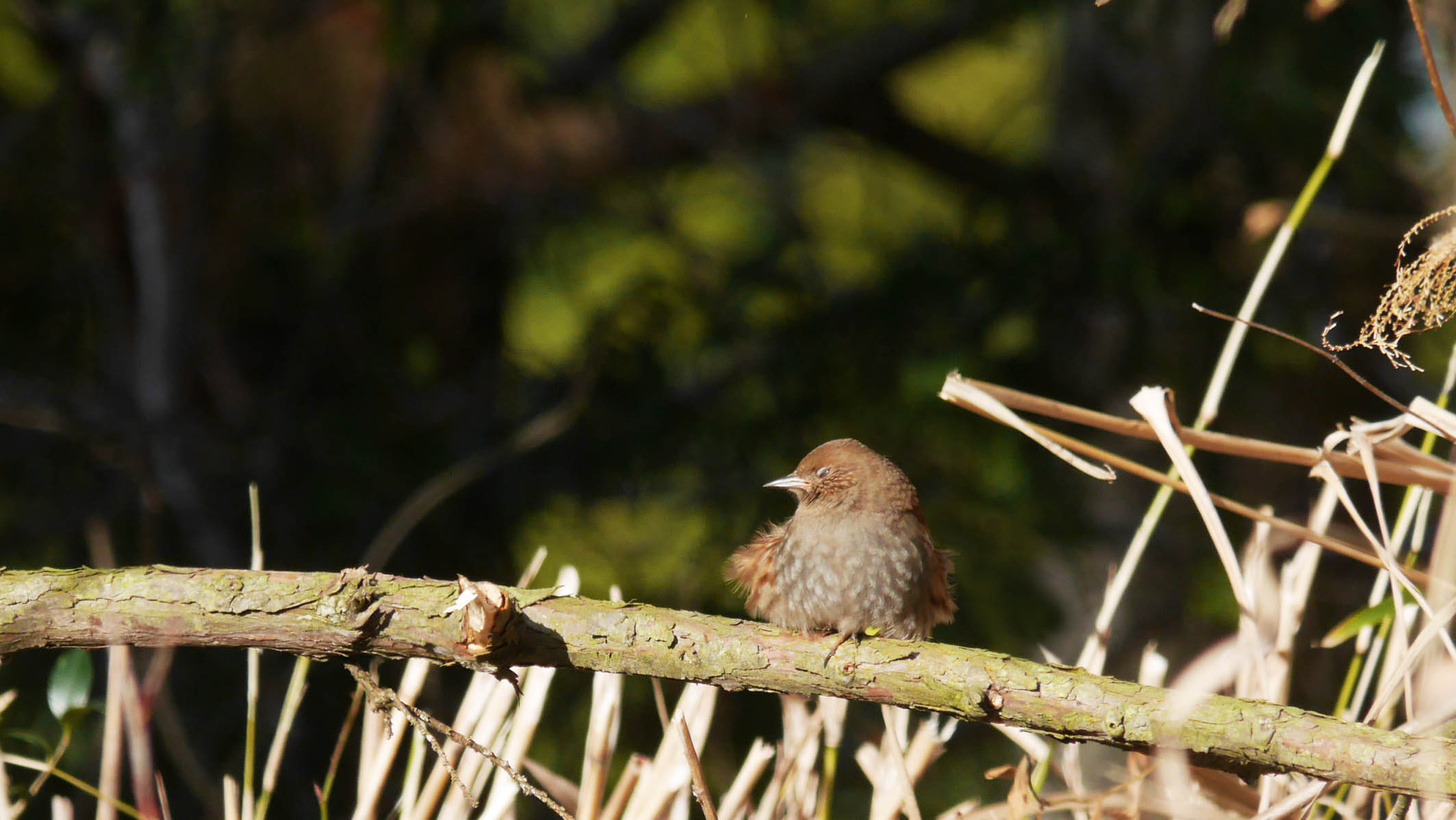 そして今朝、8時頃にチェックに入ると5~6羽が餌場から飛び立ち、最後に飛び立った小鳥だけが焦げ茶色に見えたのでカヤクグリ・・・と推測してその場で待機。