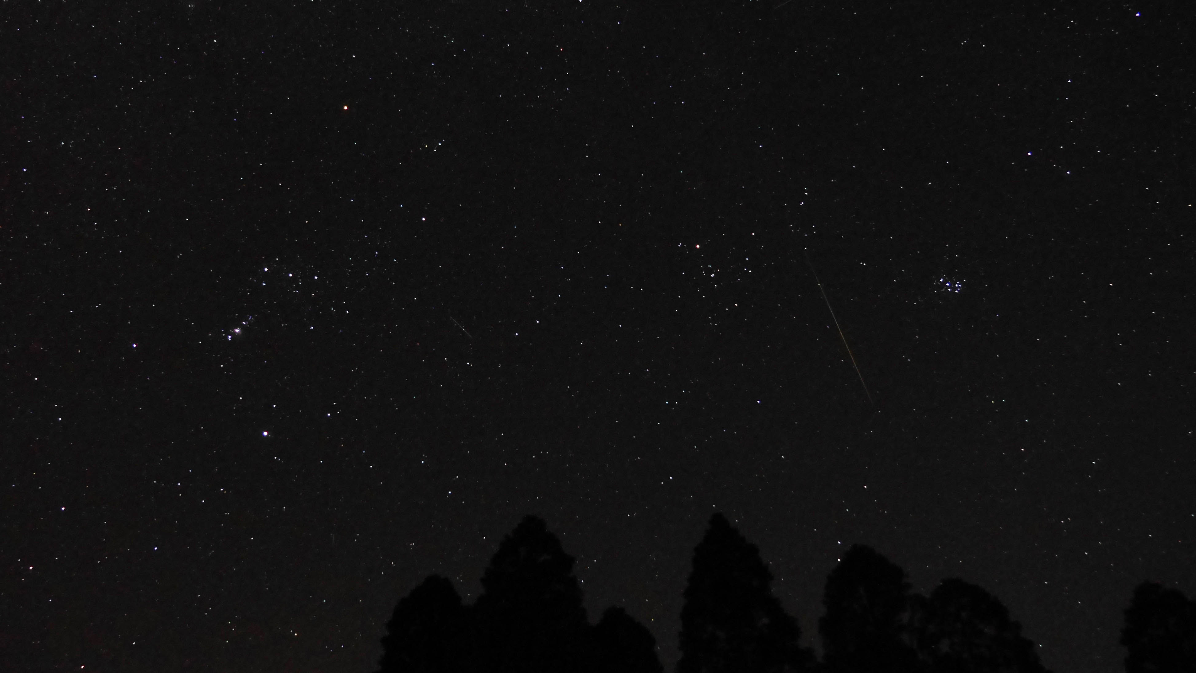 23日早朝の久住、短いのは人工衛星、長いのはオリオン座流星群の一つ
