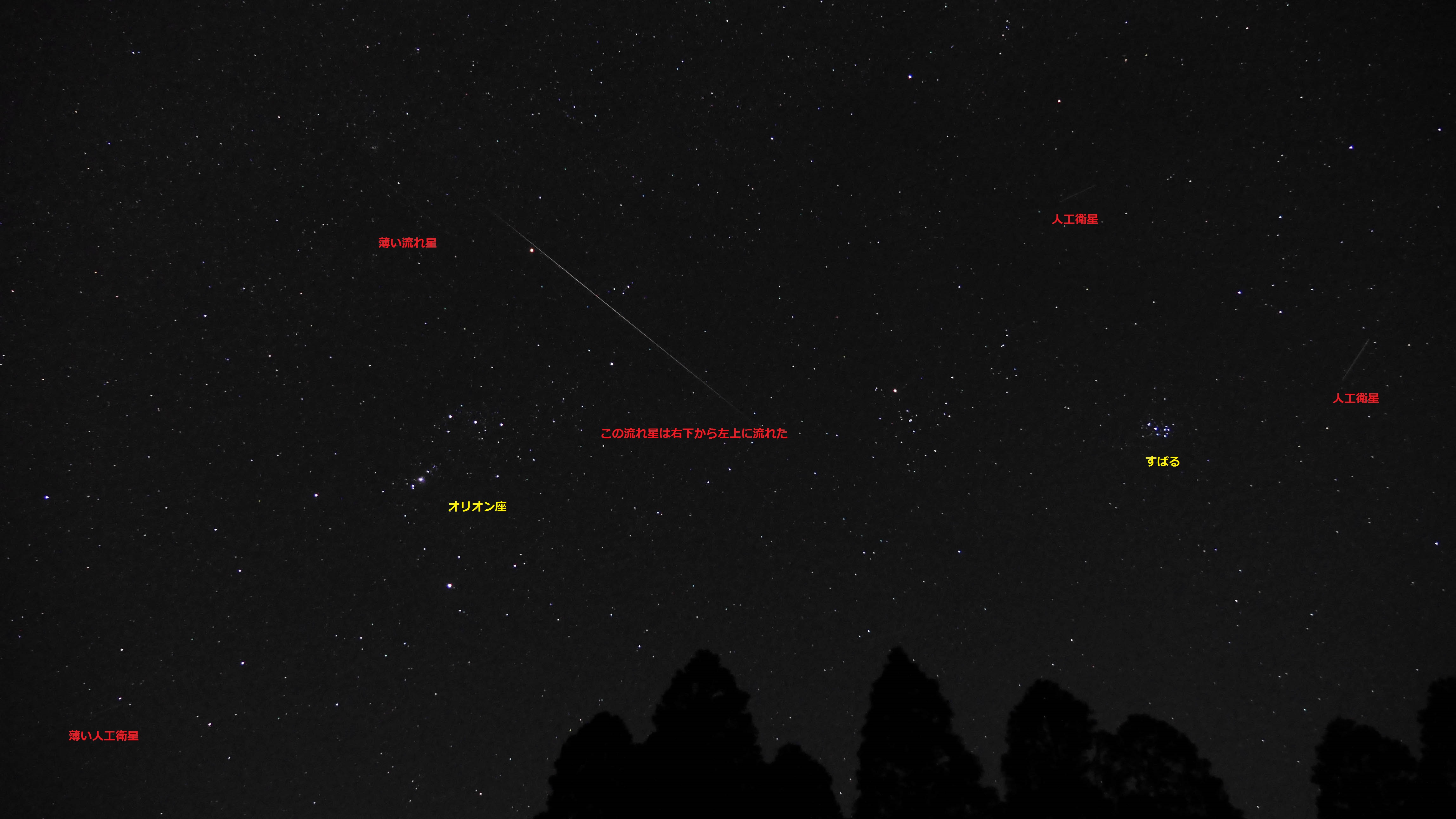 23日は金曜日で、TVでのネイチャー写真を紹介するため、撮れたての画像を急いで編集してブログにも紹介しましたが、先ほど当日の写真をチェックしてみると、元データは流れ星も人工衛星もプラスで写り込んでいました。
